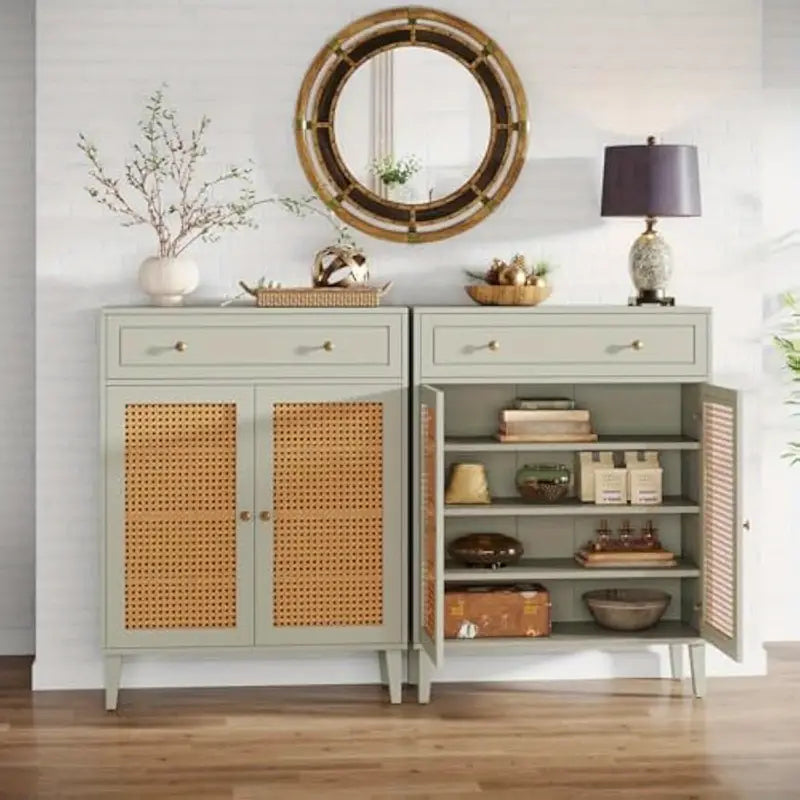 【Design sofisticato】: Decorato con una rinfrescante tonalità verde menta, questo armadio emana un'atmosfera contemporanea e chic. L'inserimento di pannelli in rattan conferisce un tocco di eleganza rustica, creando una miscela armoniosa di elementi moderni e tradizionali. Abbastanza versatile da completare diversi temi di arredamento, il suo design unico migliora l'atmosfera estetica di qualsiasi stanza.