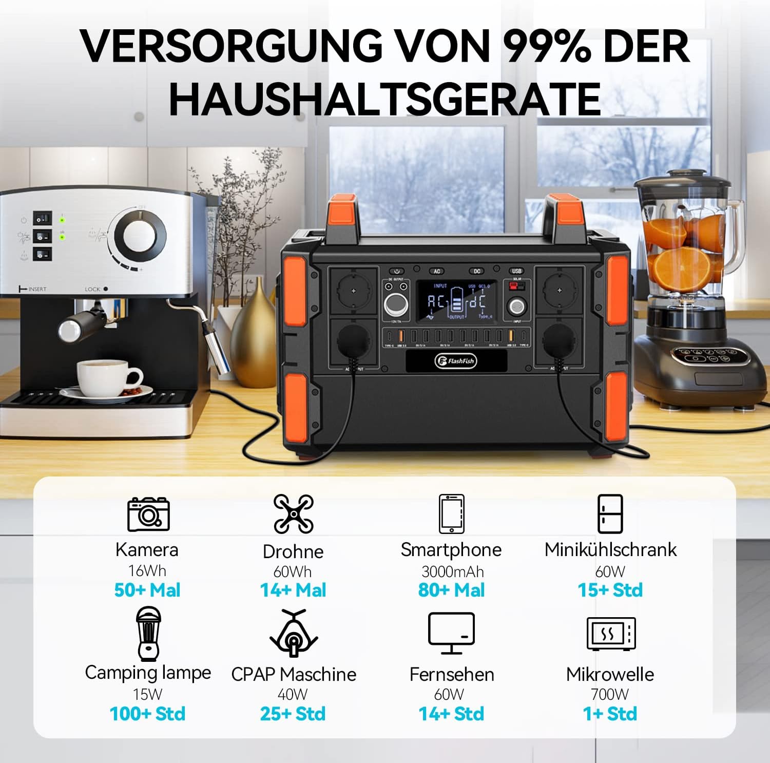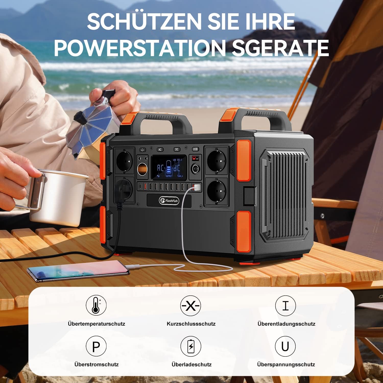 Con la Flashfish F132, puoi alimentare fino a 19 dispositivi contemporaneamente grazie alle sue numerose porte: 4 prese AC a onda sinusoidale pura, 2 uscite DC, 8 USB, 2 USB QC 3.0, 2 Type-C e 1 porta accendisigari. Perfetta per viaggi, campeggio, lavoro all’aperto o come backup in casa.