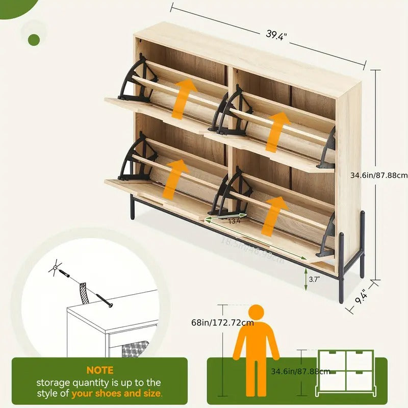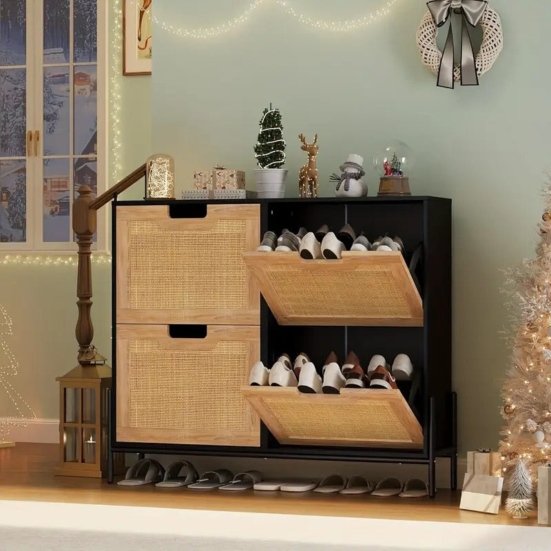 Stevig en duurzaam: De steunpoten van deze rotan schoenenkast zijn gemaakt van metaal en de andere planken zijn gemaakt van massief hout, wat stevig en duurzaam is. De bovenkant van de schoenenkast heeft een anti-kantelbeveiliging om de veiligheid tijdens het gebruik te garanderen.