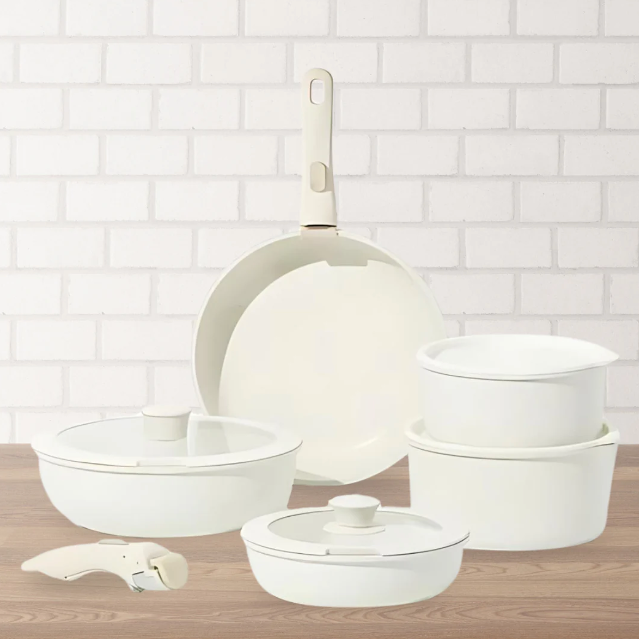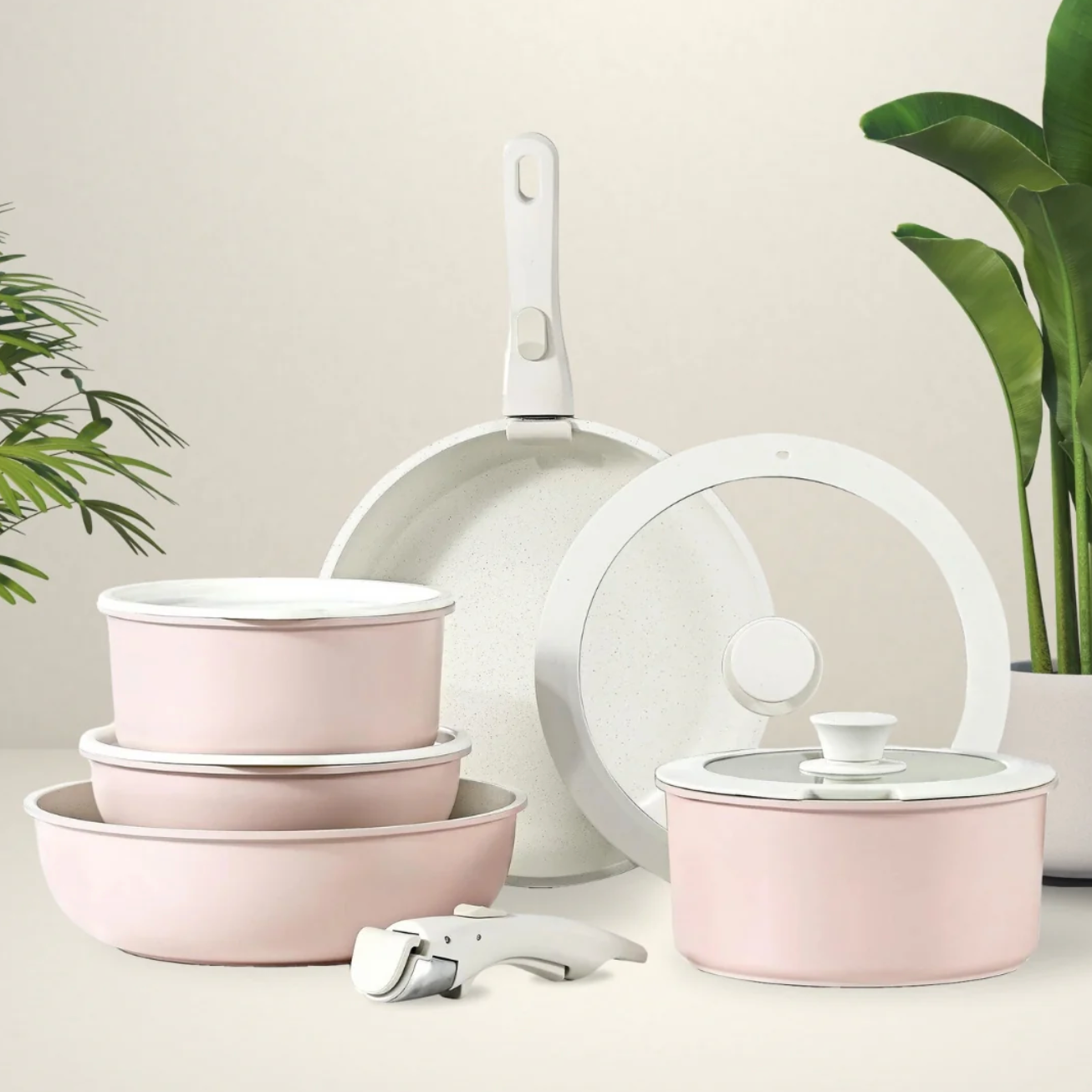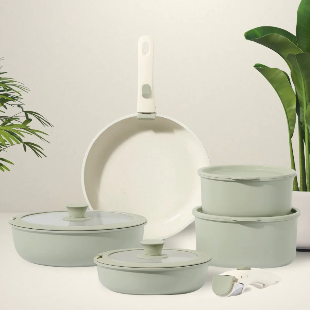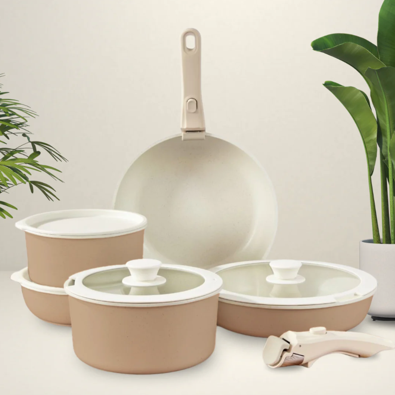 Il set di pentole utilizza un design con manici rimovibili per risparmiare spazio nella tua cucina.